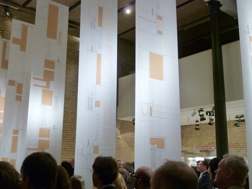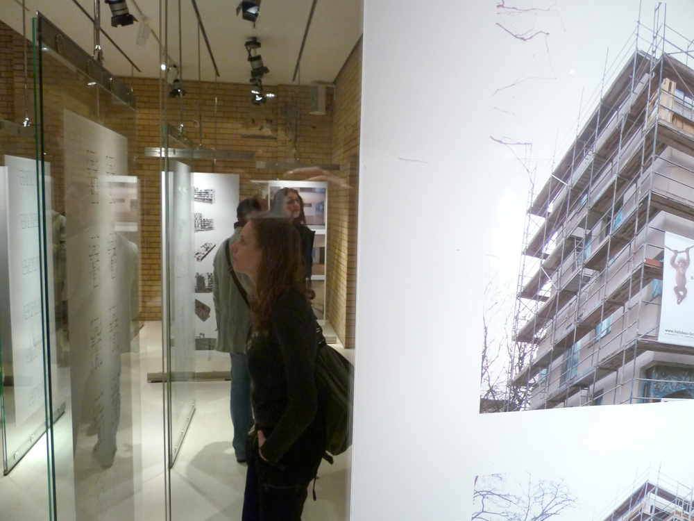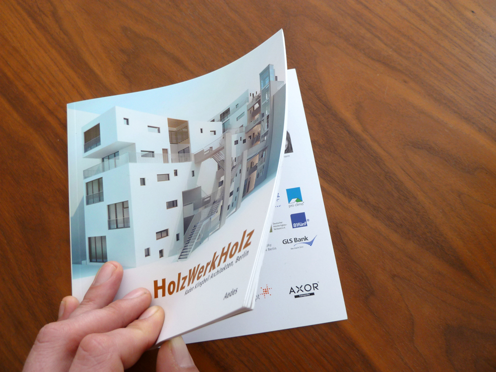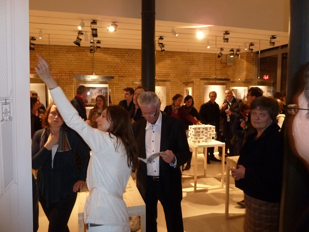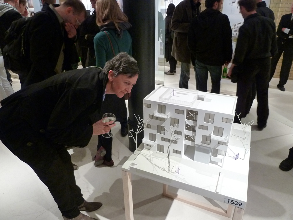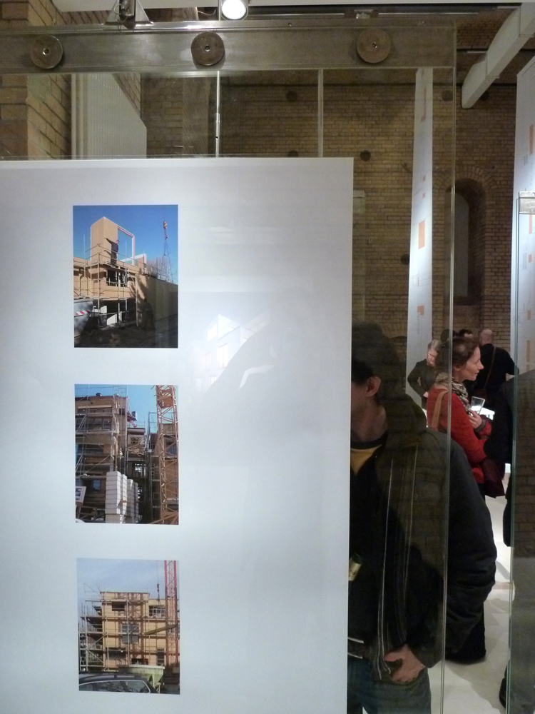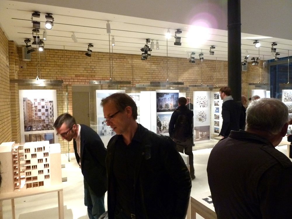 Detailzeichnungen auf Banner gedruckt, zwischen Glasscheiben eingefasste Fotografien von Holzbauwerken und beschriftete Modelle: Die Ausstellung HolzWerkHolz in Berlin zeigt die Entwicklung und technische Details des modernen Holzbaus. pro clima Grafiker Albert Bomerski, der selbst Architektur studiert hat, war mit 150 Besuchern bei der Eröffnung am Freitag, 23. März 2012 , dabei. Für das Architekturbüro Kaden & Klingbeil ist es die erste Ausstellung in der renommierten Architekturgalerie aedes.