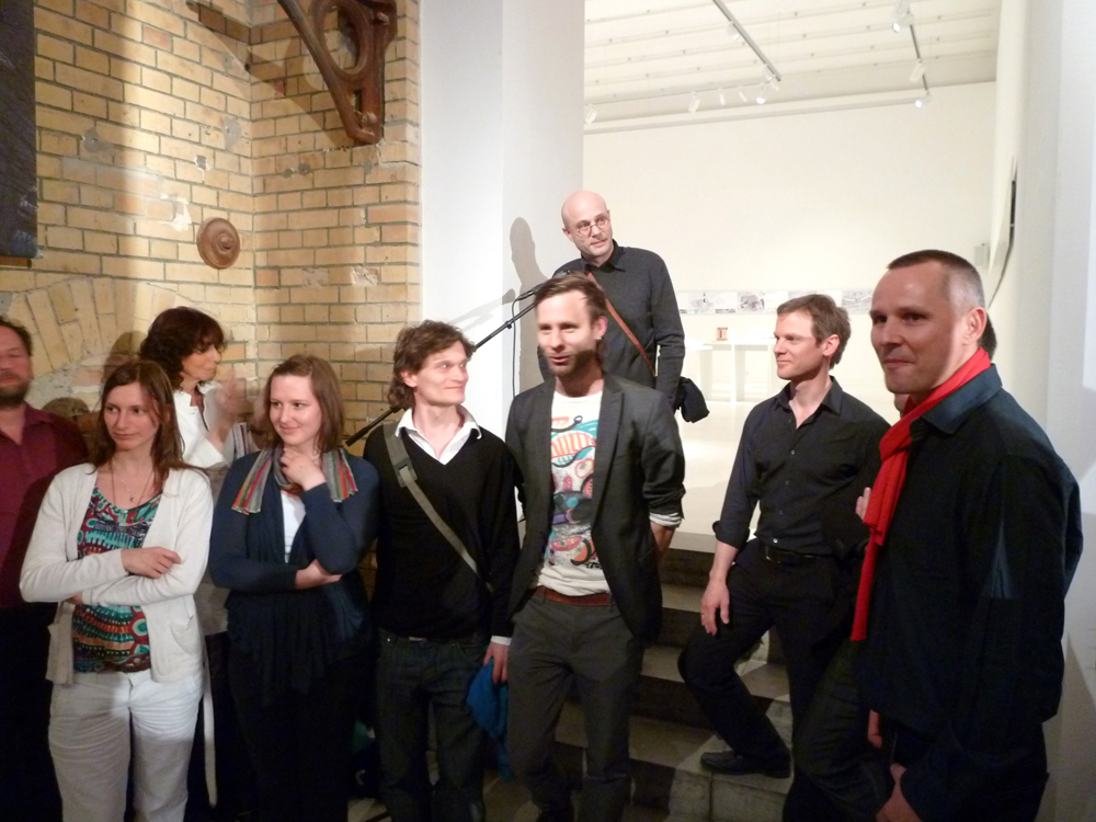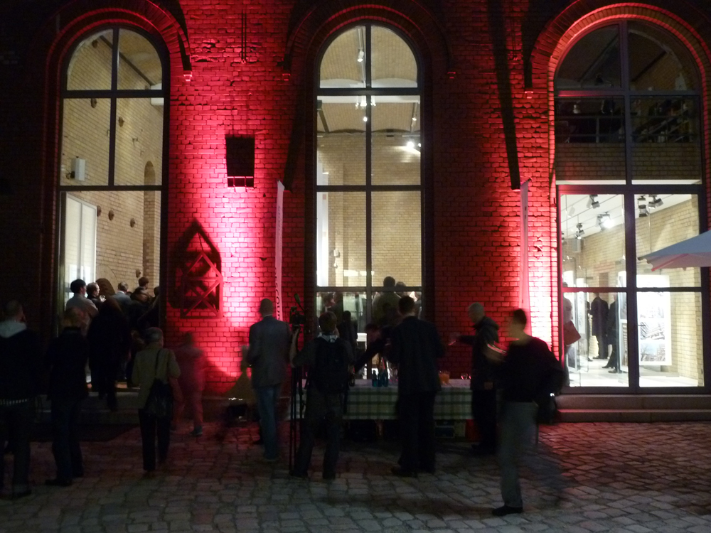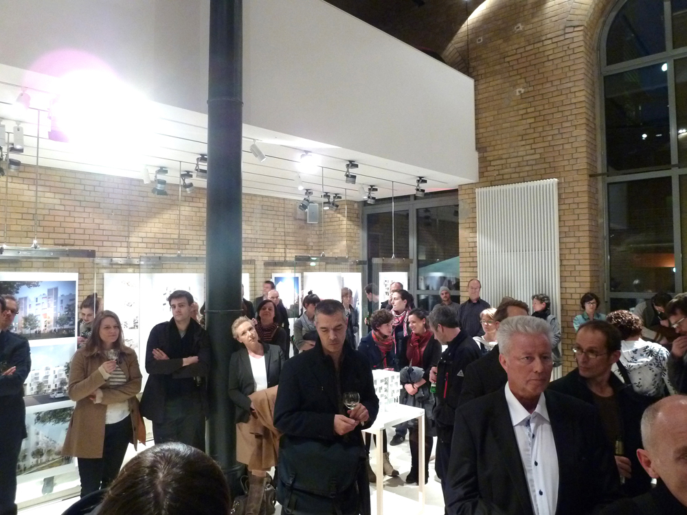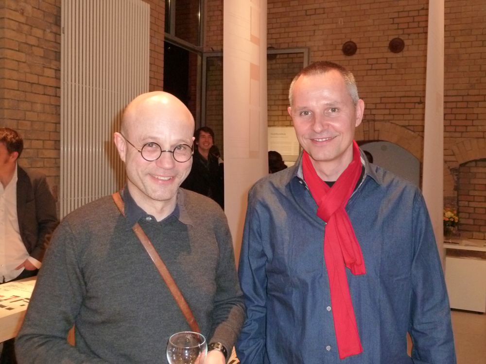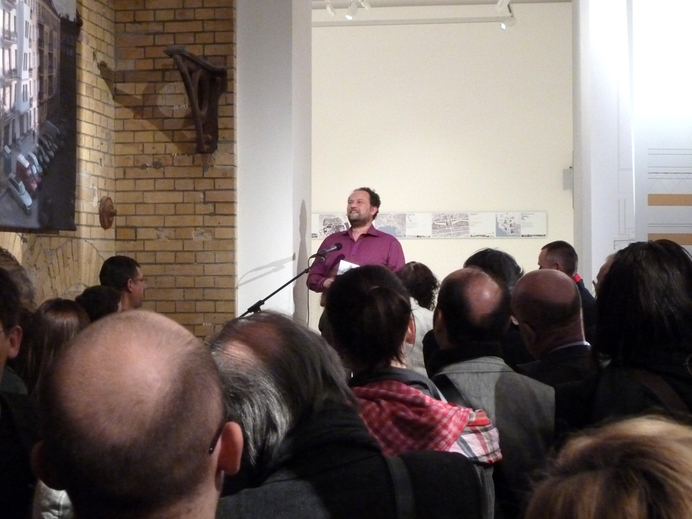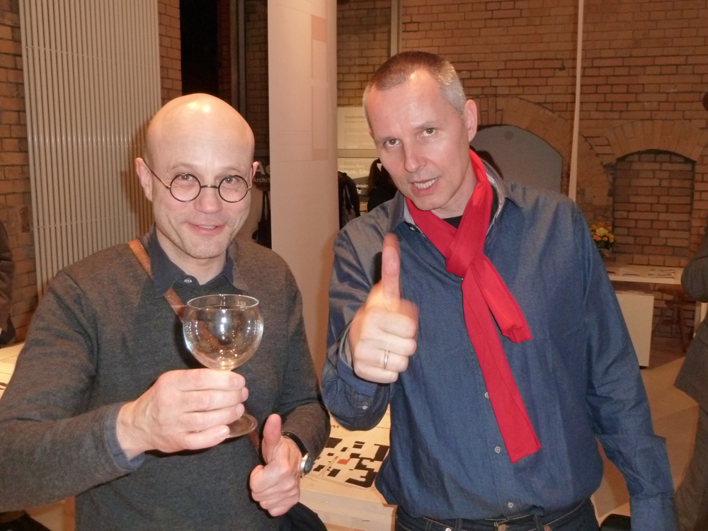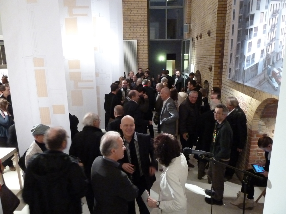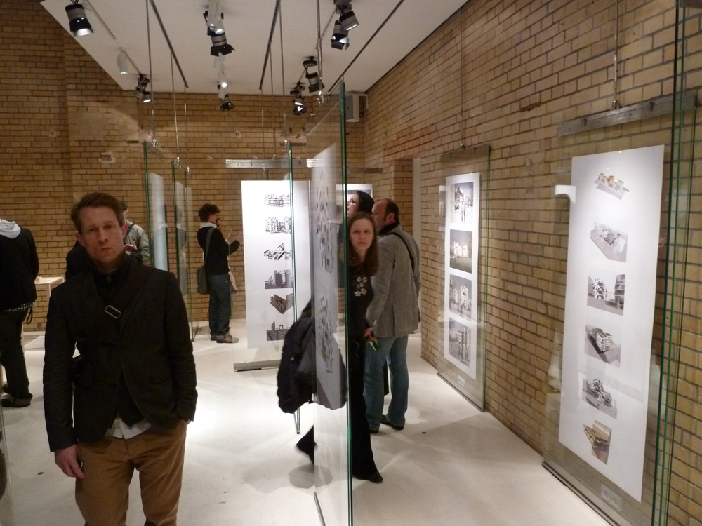 Detailzeichnungen auf Banner gedruckt, zwischen Glasscheiben eingefasste Fotografien von Holzbauwerken und beschriftete Modelle: Die Ausstellung HolzWerkHolz in Berlin zeigt die Entwicklung und technische Details des modernen Holzbaus. pro clima Grafiker Albert Bomerski, der selbst Architektur studiert hat, war mit 150 Besuchern bei der Eröffnung am Freitag, 23. März 2012 , dabei. Für das Architekturbüro Kaden & Klingbeil ist es die erste Ausstellung in der renommierten Architekturgalerie aedes.