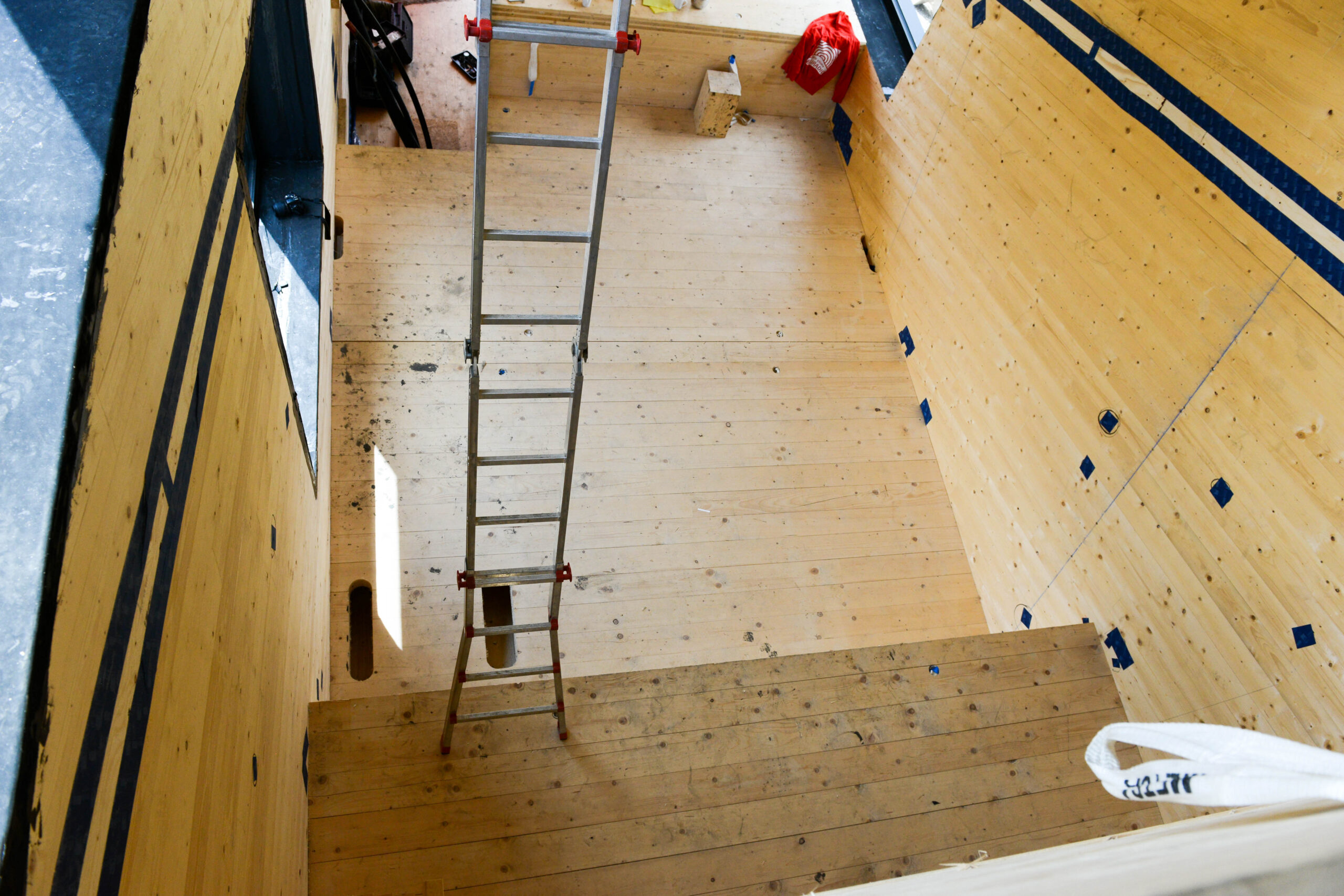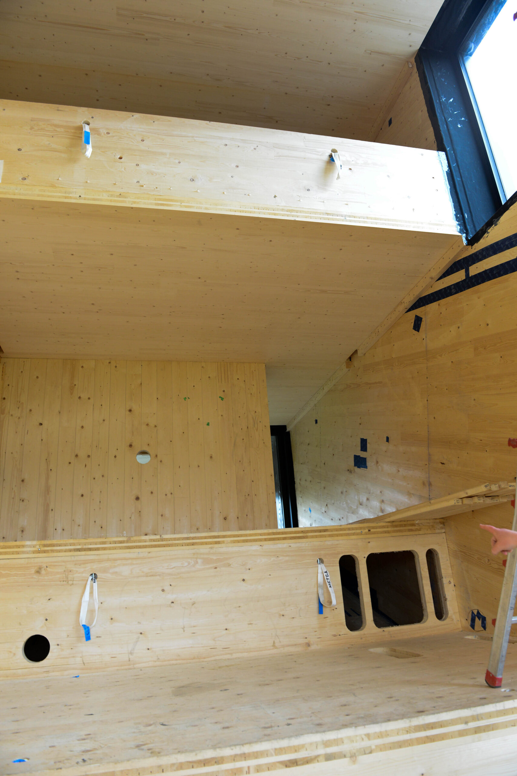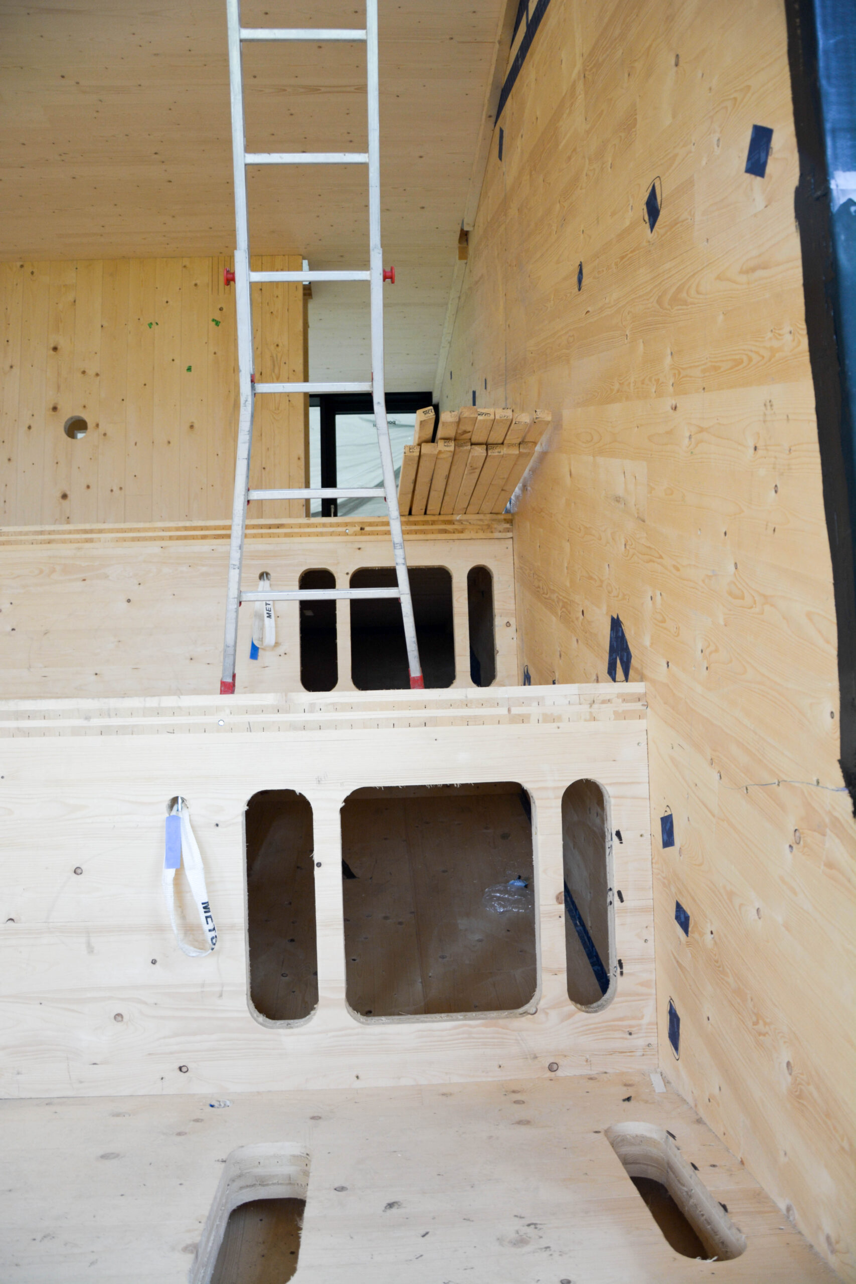 Neun Quadratmeter. So groß wird der Boden des Arbeitszimmers von Henrike Gänß. Eng findet die 32-Jährige ihre künftige Arbeitsstätte trotzdem nicht. Denn sie hat diese so konstruiert, dass sie gleichzeitig auf 112 Kubikmeter großen Wohnraum blickt. In diesem Zuhause gibt es nämlich keine Wände. Die Grundfläche von 50 Quadratmeter ist auf verschieden hohen Ebenen – Splitlevels – verteilt, in Arbeits- und Wohnzonen. Und die Möbel bilden sich aus der Konstruktion heraus: Auf der einen Seite bildet der Boden beispielsweise die Funktion eines Tisches, von der anderen Seite die eines Stauraums. Ein paar Meter weiter vorne können die künftigen Bewohner sich an der Rückseite einer Präsentationsfläche anlehnen und essen.