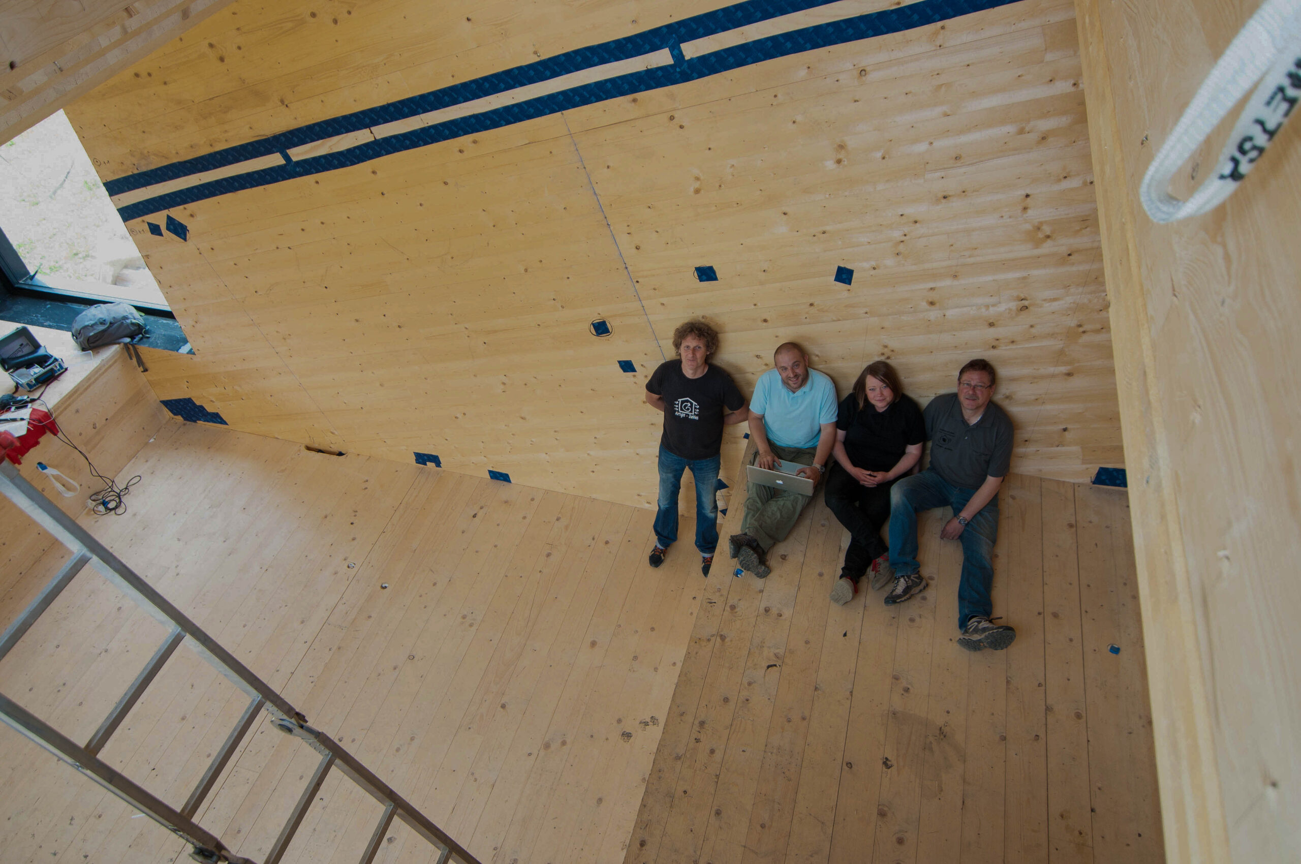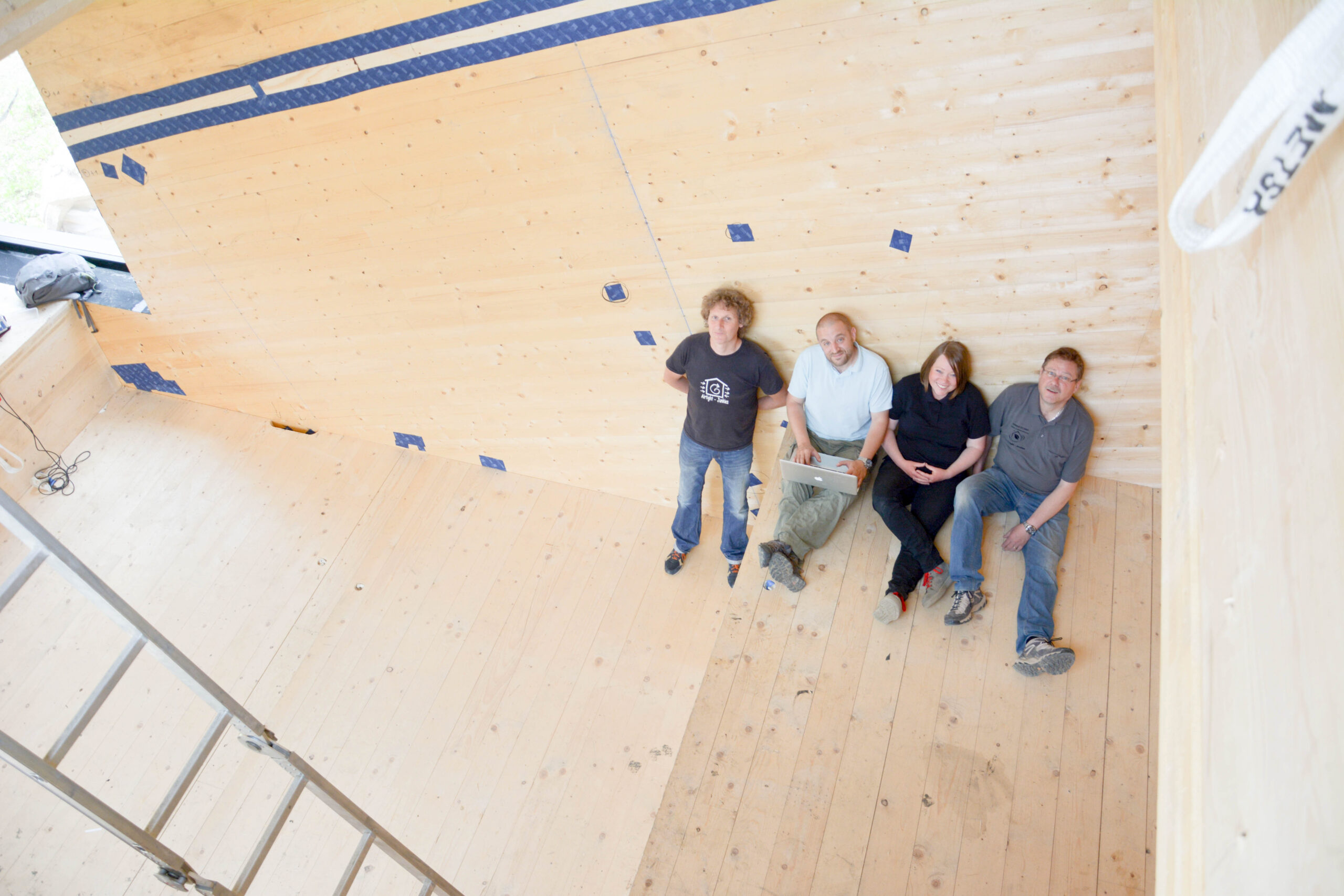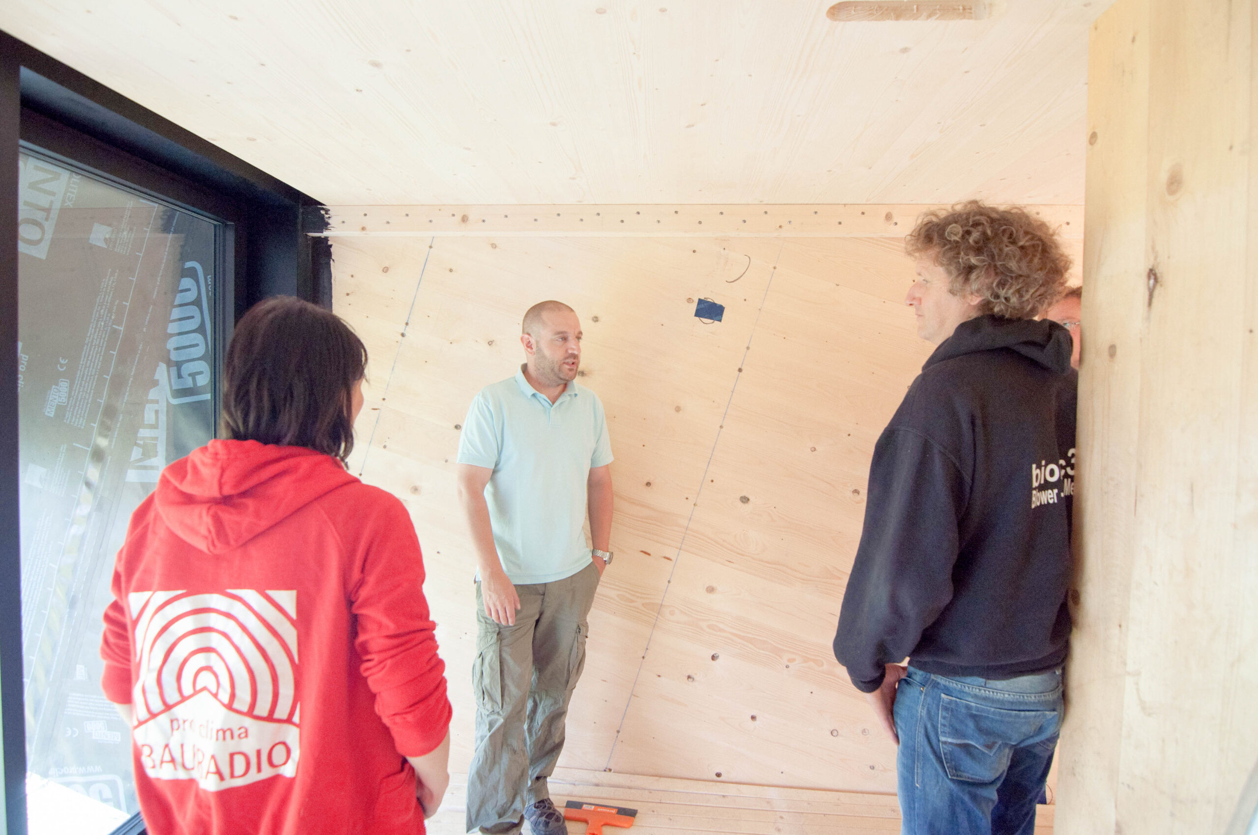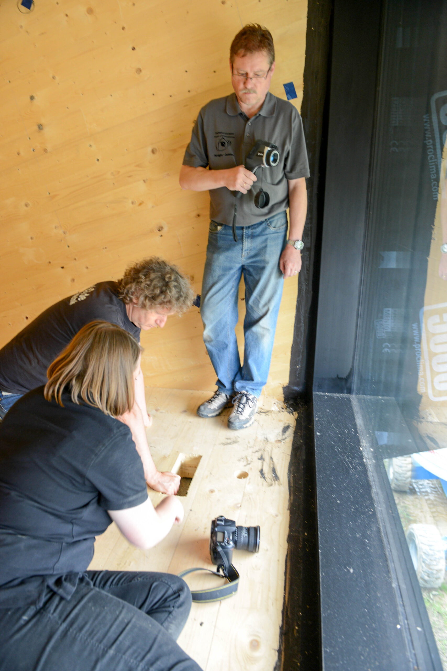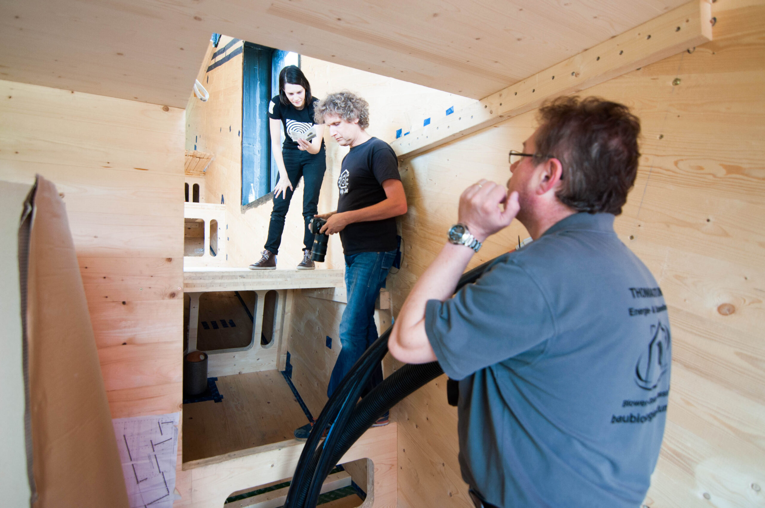 Mit dabei war auch das pro clima Außendienstteam Süd-West: Holger Merkel, Geschäftsführer bionic3 GmbH hat die BlowerDoor-Messung gesponsert und mit seinem Kollegen durchgeführt. Gemeinsam mit den künftigen Bewohnern haben sie nach Leckagen gesucht. Gemeinsam deswegen, weil Henrike Gänß und Marc Rother, jedes Gewerk kennenlernen wollen.