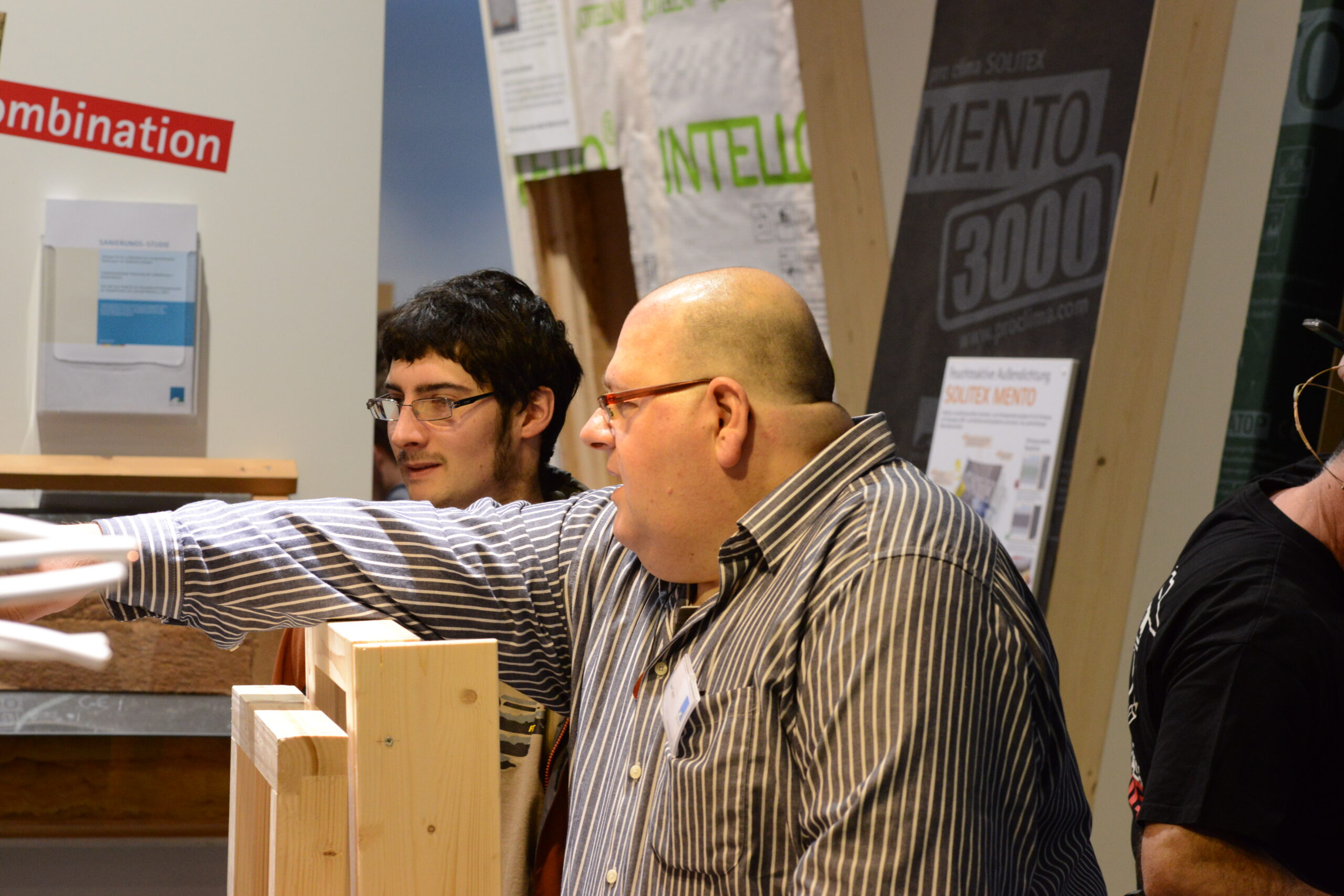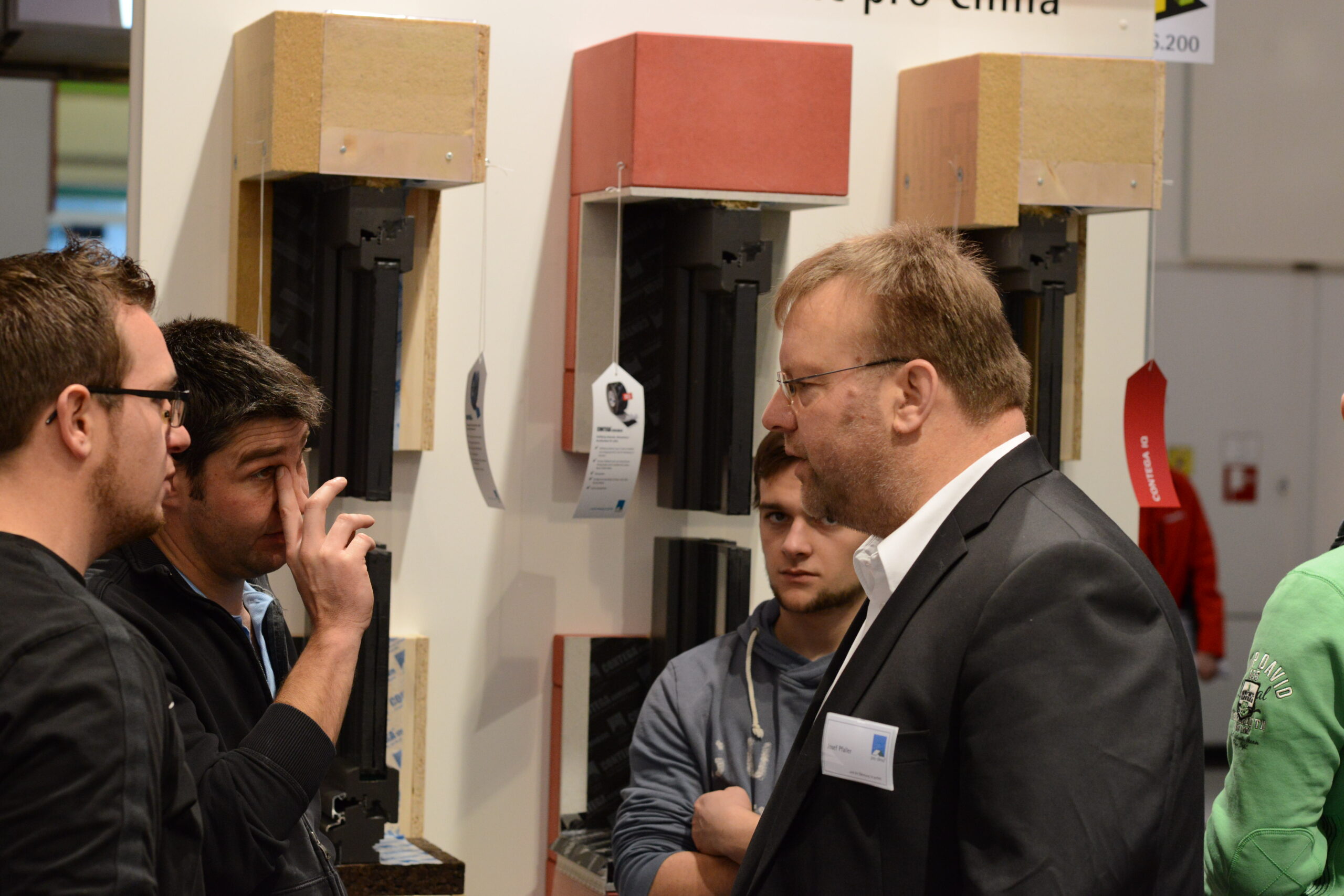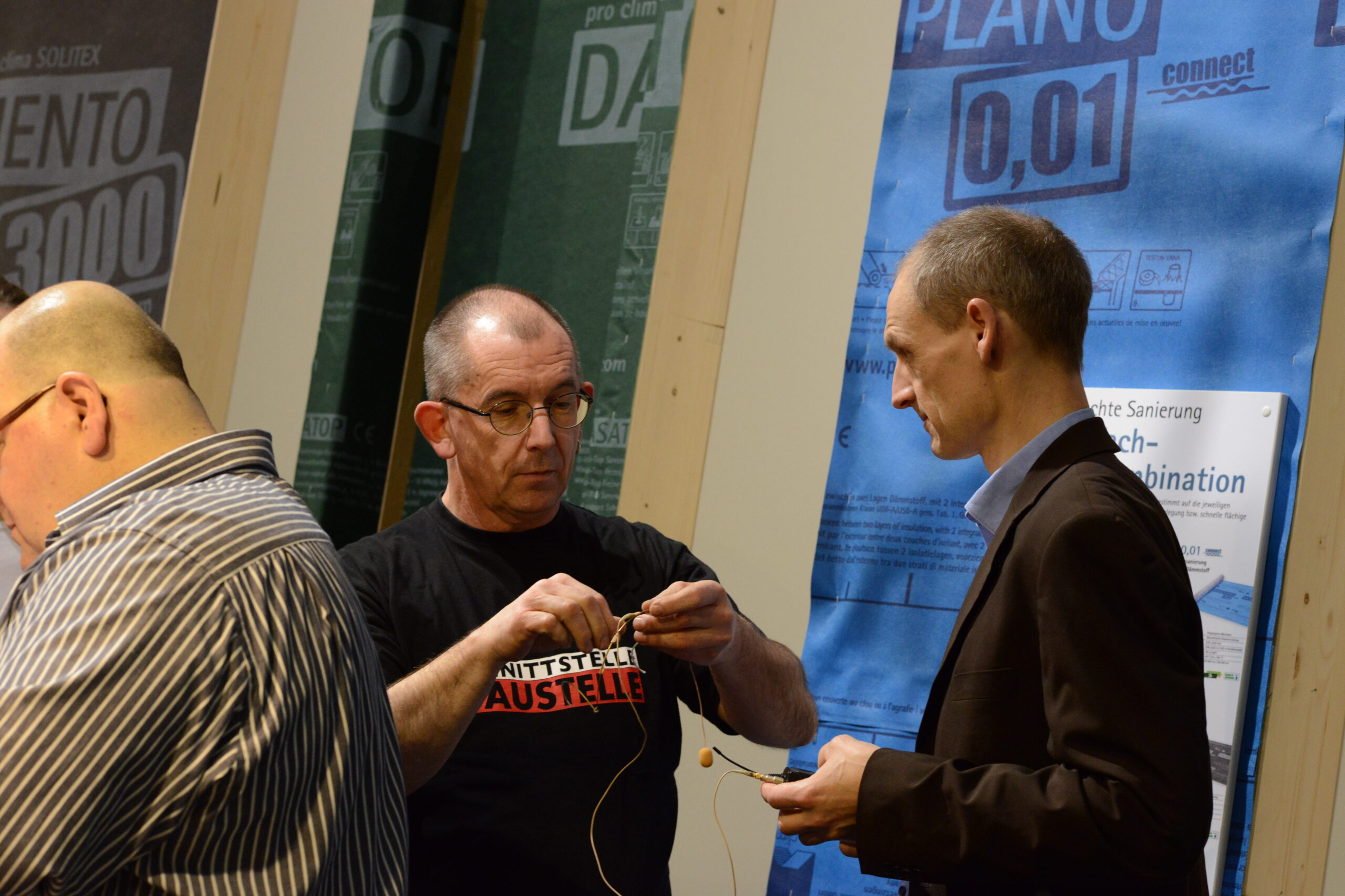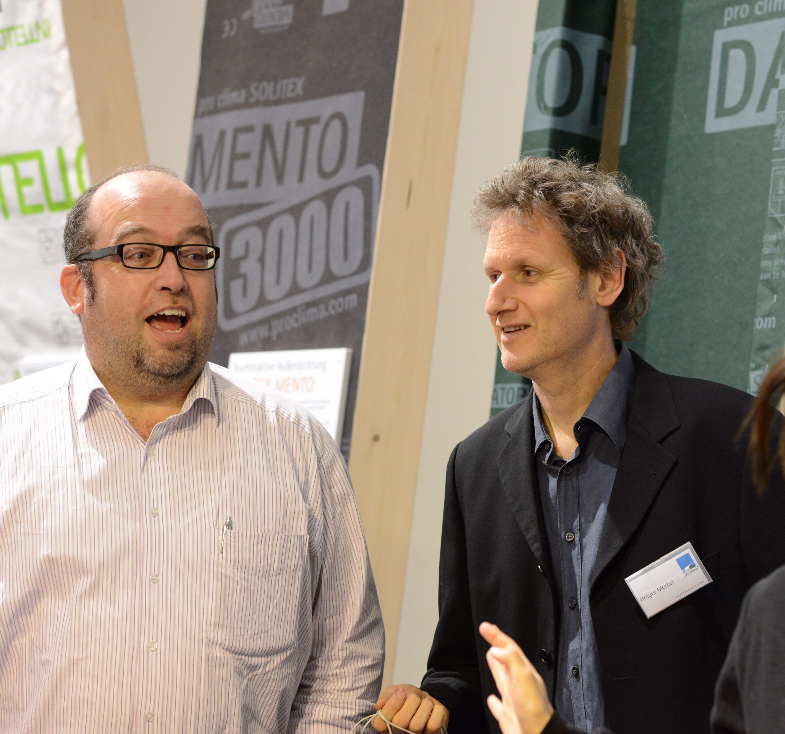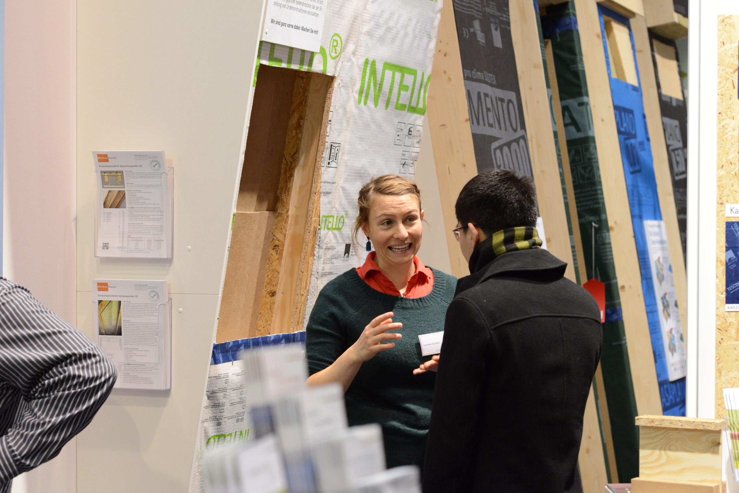 Oliver Goldau, Leitung pro clima Marketing, führt über den Messestand und erläutert dabei die verschiedenen pro clima Lösungen zu Luftdichtung innen und Winddichtung außen.