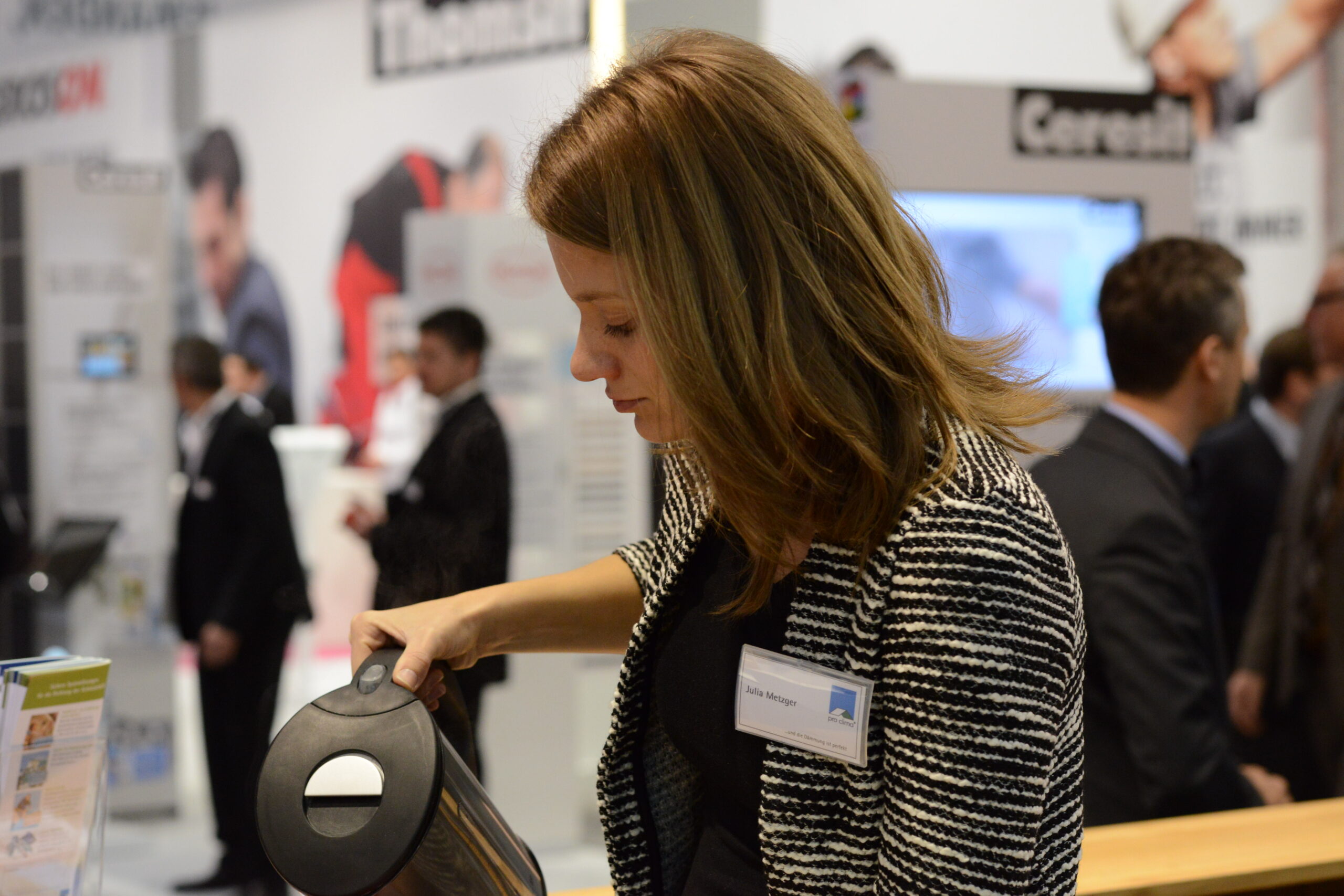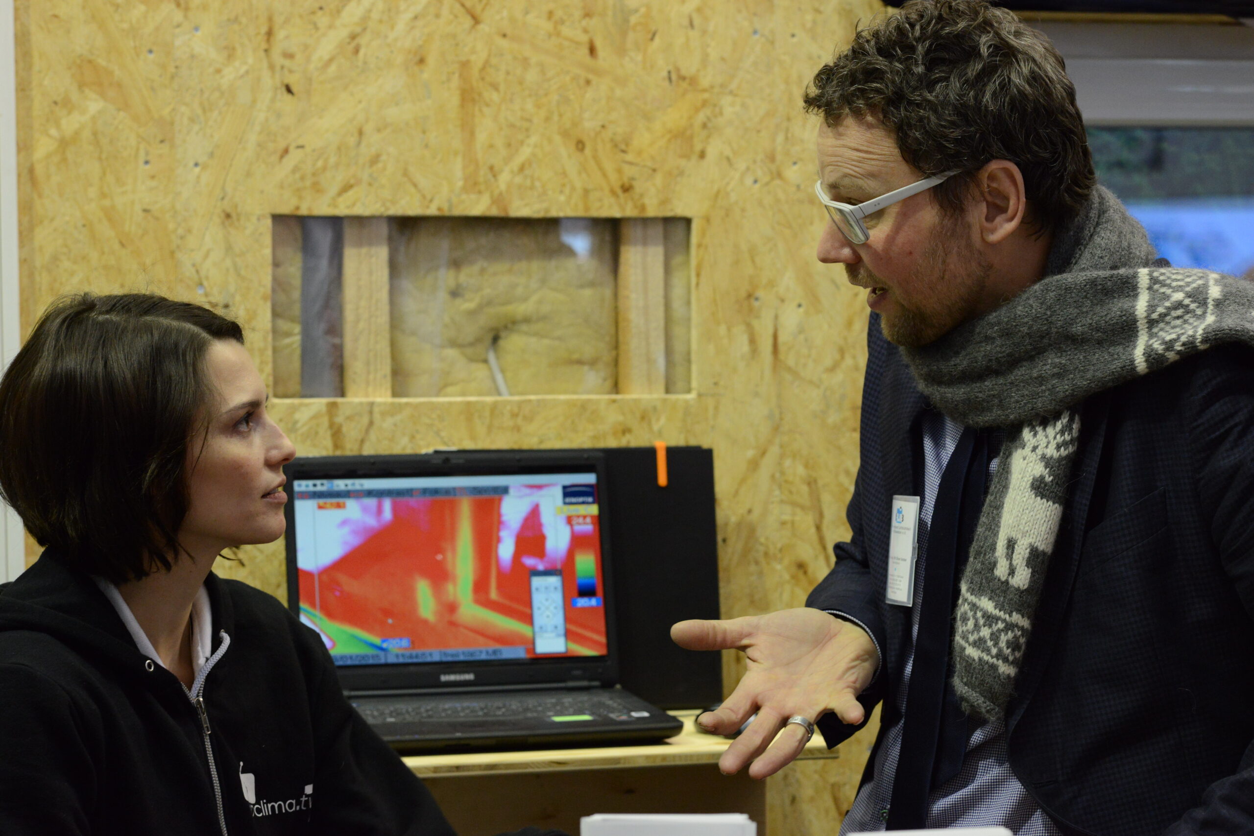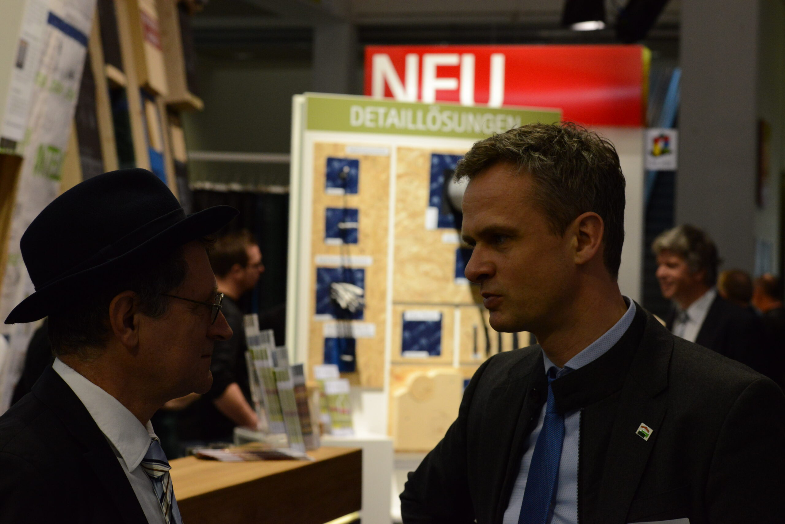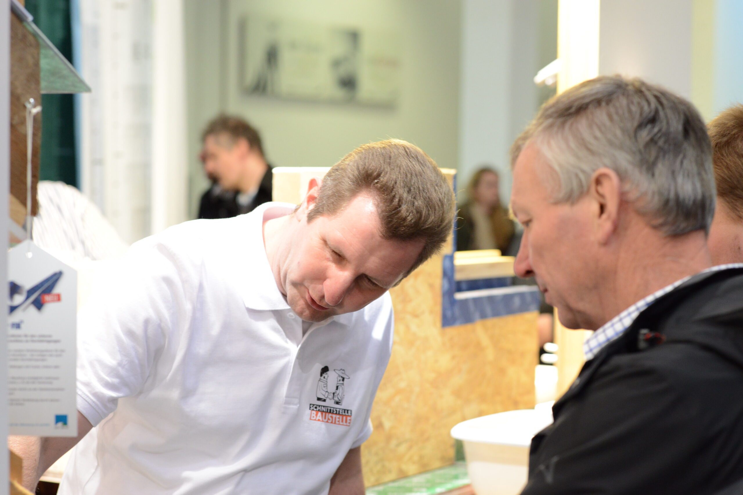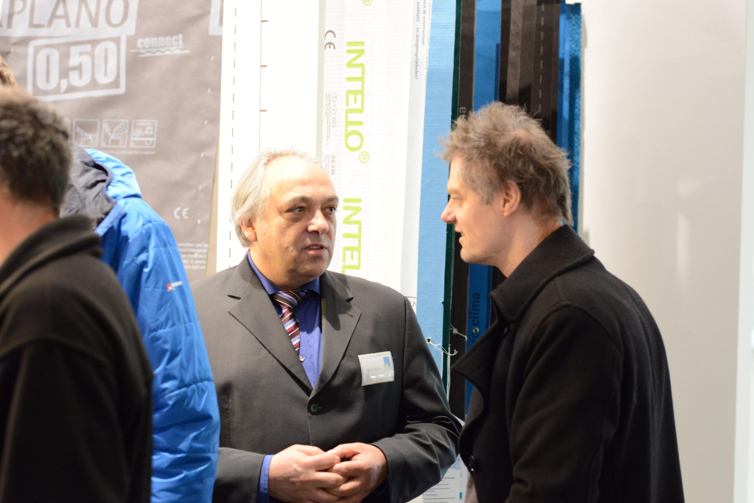Oliver Goldau, Leitung pro clima Marketing, führt über den Messestand und erläutert dabei die verschiedenen pro clima Lösungen zu Luftdichtung innen und Winddichtung außen.