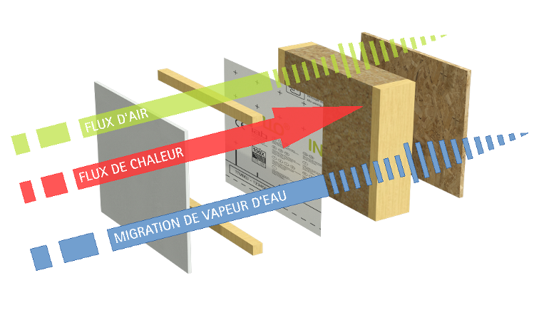La nature tend en permanence à un état d’équilibre. Ainsi, lorsque deux environnements ont des taux d’humidité différents, l’humidité sous forme de vapeur d’eau va se déplacer : c’est la diffusion. La direction du flux de diffusion est déterminée par le gradient de pression partielle de vapeur d‘eau. Cette pression partielle dépend de la température et du taux d’humidité de l‘air à l’intérieur et à l’extérieur du bâtiment. Un gradient élevé, donc une grande différence de pression partielle de vapeur d’eau, agit comme une force motrice qui transfert l’humidité vers la zone présentant le moins d’humidité. Par analogie, le gradient de température implique des transferts de chaleur par conduction. Usuellement, la diffusion se fait de l’intérieur vers l’extérieur en hiver, du chaud vers le froid, et de l’extérieur vers l’intérieur en été (c’est l’inversion des flux ou diffusion inverse). Une mauvaise gestion de l’humidité et de la température au sein des parois peut instaurer des conditions défavorables, et impliquer des dégradations des composants.